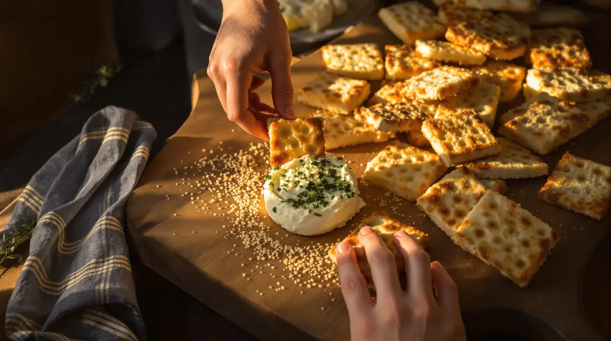 Pour un effet “waouh” sans stress, disposez vos crackers encore tièdes sur une grande planche en bois. Ajoutez autour quelques noix, amandes, figues sèches ou raisins secs. Complétez avec quelques cubes de fromage, des olives, et un petit bol de dip.